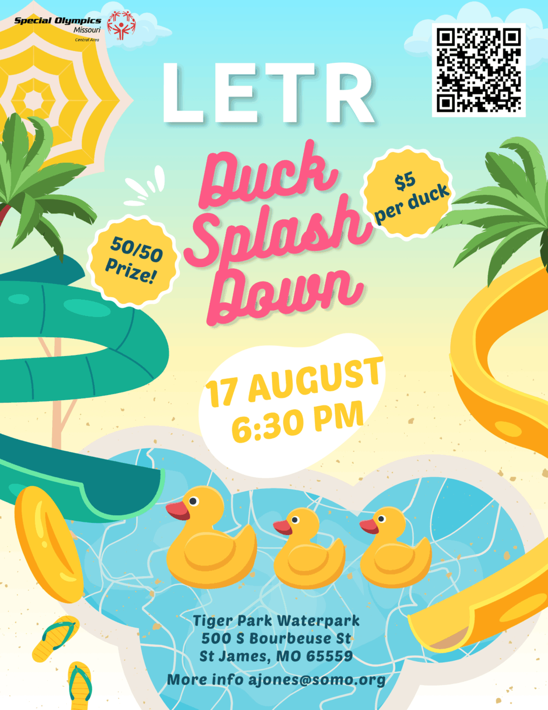 Purchase a duck to support our LETR Duck Splashdown! You could win 50% of the funds raised, with the rest going to support our athletes. A fun way to make a big splash for a great cause!