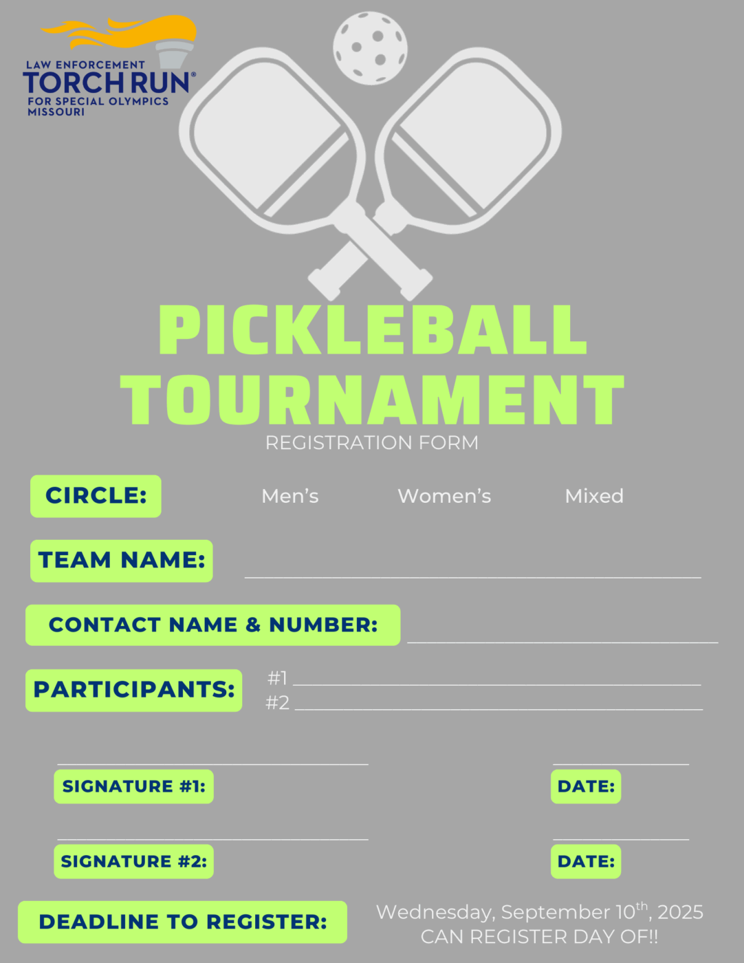Food, drinks, a silent auction, and a raffle will be available throughout the day. Registration begins at 8:00 a.m., Opening Ceremony at 8:45 a.m., and tournament play begins at 9:00 a.m. at the Training for Life Campus in Jefferson City.
